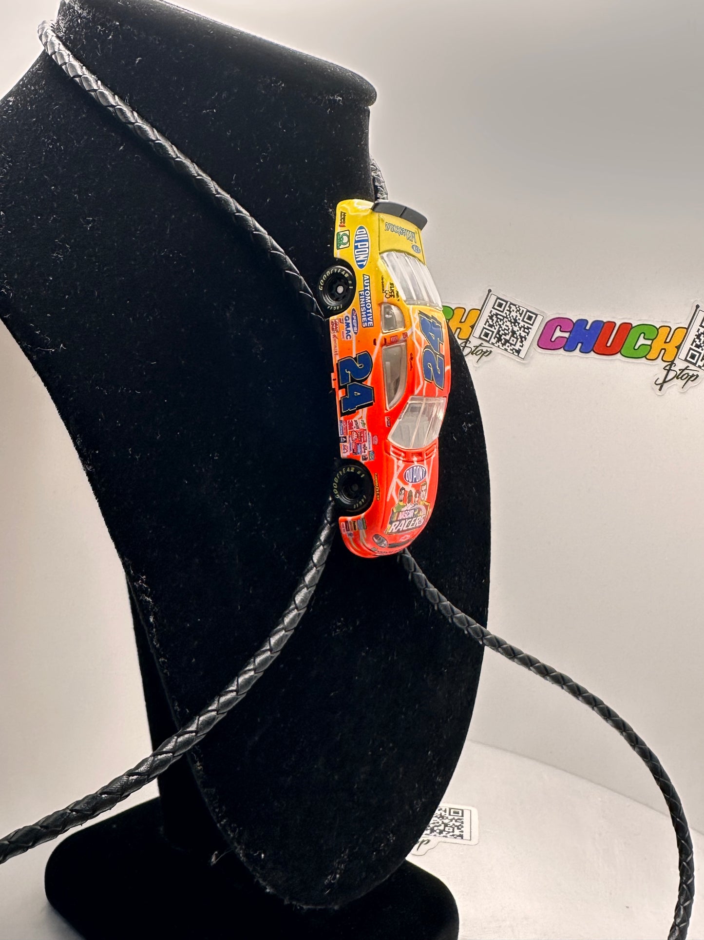 Jeff Gordon's 2000 Nascar Racers Chevrolet Monte Carlo Nascar Bolo Tie. Included with this bolo is a collector’s card! Each bolo is cut to 37“ long! End tips are as seen in the picture, either silver or gold.